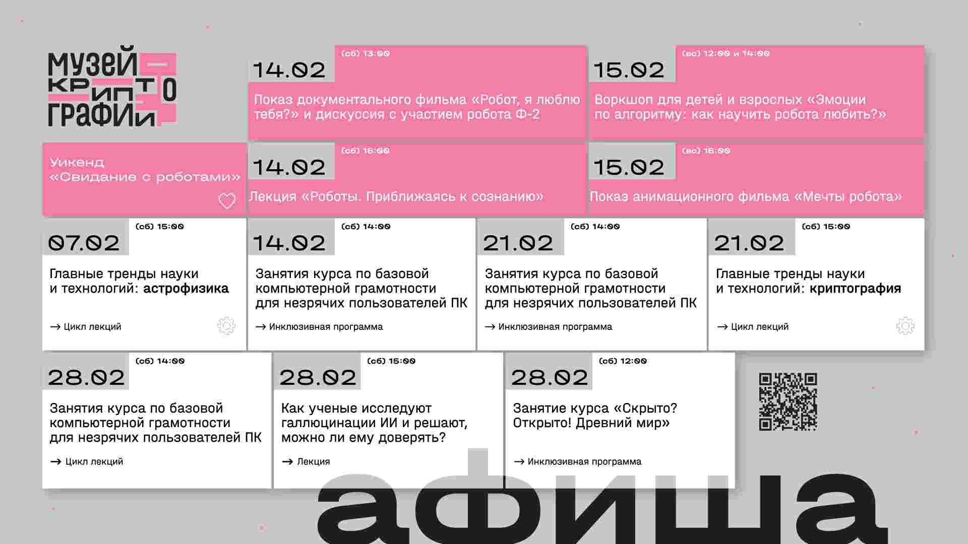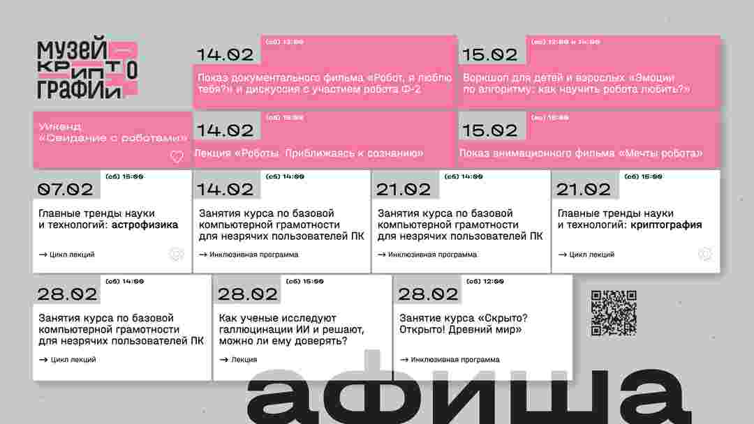 На этой странице собраны все события публичной программы Музея криптографии, которые пройдут в феврале. Подробнее о каждом можно узнать по ссылкам.