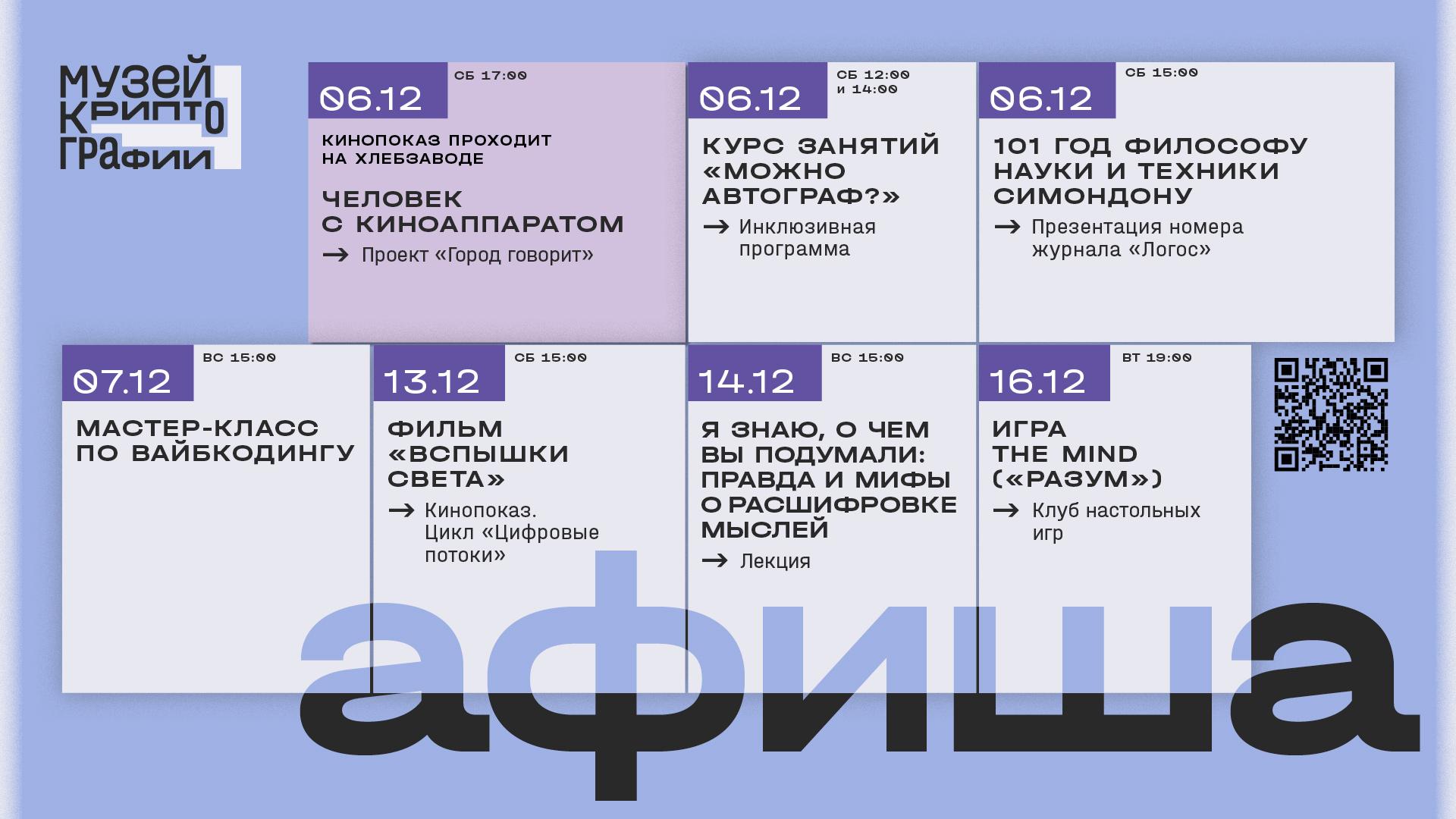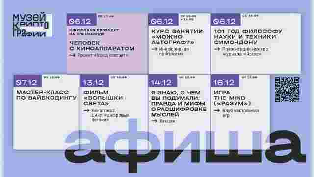 На этой странице собраны все события публичной программы Музея криптографии, которые пройдут в декабре. Подробнее о каждом можно узнать по ссылкам.